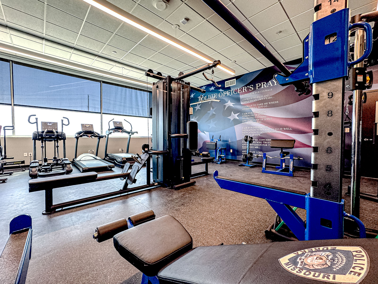 The police department features secure access entry, offices, large multipurpose training center equipped for temporary EOC, secure sally port, detention with separate juvenile entry and detention, evidence processing & storage areas, armory, interview rooms (hard interview and soft interview), locker rooms, ICC 500 storm shelter, fitness center, secure and fenced parking for police fleet.