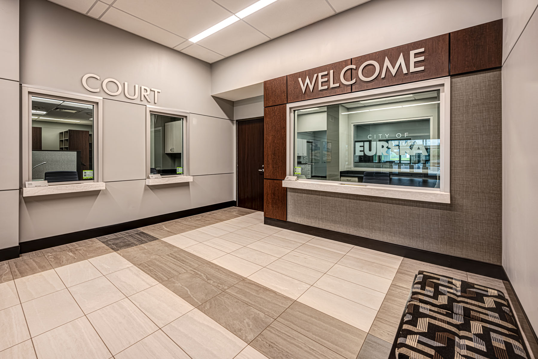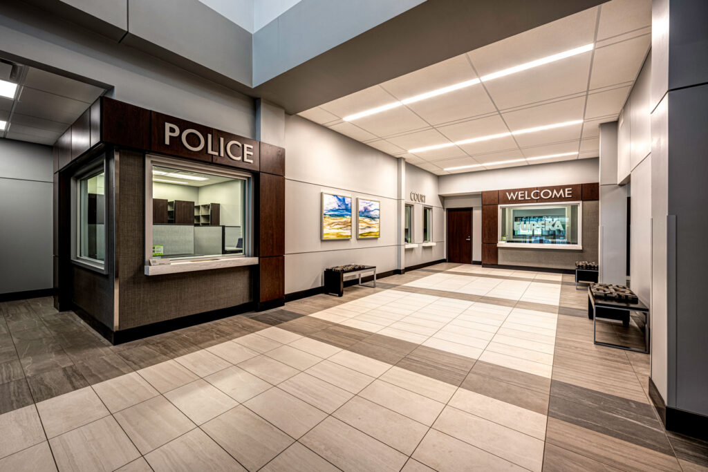 New combined government facility housing the city hall and police department. The building features entry vestibule with bullet resistant film, secure lobby including bullet resistant glass for administrative lobby desk and court clerk and police clerk windows, city hall/city administration offices, council chambers, municipal courts, and breakroom (shared between city hall and police).